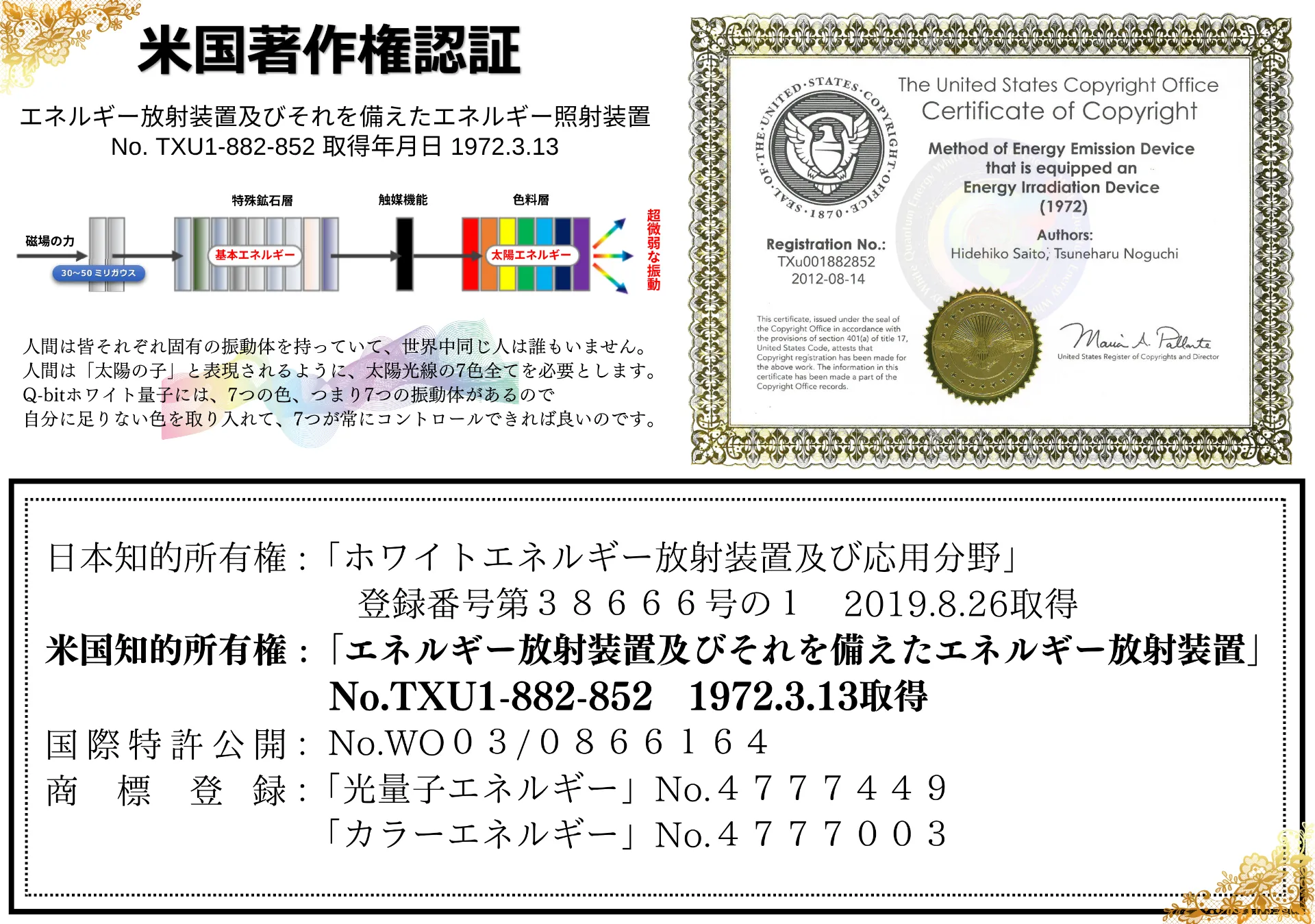私の開発したQ-bitホワイト量子で、あらゆる分野における量子レベルの振動エネルギーを本来の正常な状態に戻し、で対象物質をより良い物質に変化させるために邁進してまいります。